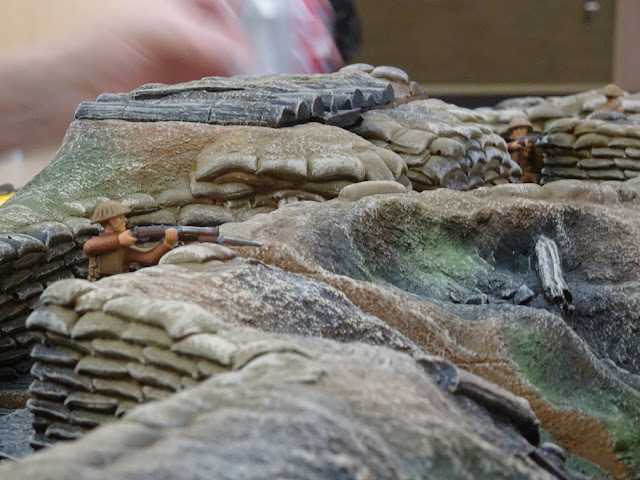 I think all the northern European members must, wisely, be on their summer holidays, but being Americans, we never take vacations ;). Yesterday we played a WW1 trench raid game in 54mm. The very simple rules are in Wargames Illustrated Issue 235. Four players each had five miniatures, either British (defenders) or Germans ( raiders). The rules, as I said, are very beer and pretzels simple, but they do allow for exciting moments like being able to pick up a thrown hand grenade and tossing it back. The game moved along so quickly that we had time to play it twice, each time with very different results.