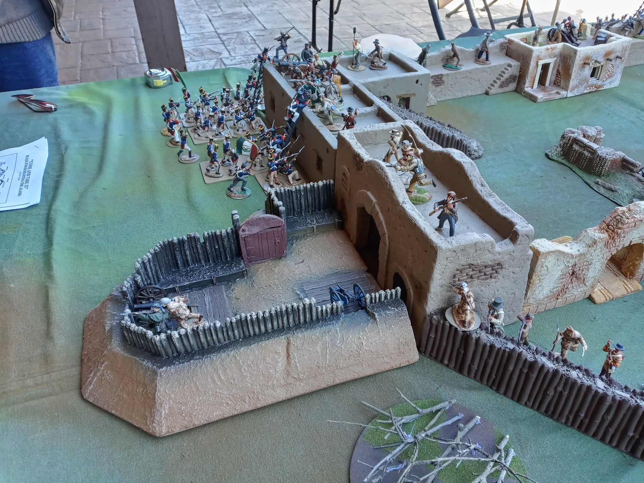 After a hiatus of half a year, we had our first club meeting, outdoors, wearing masks, yesterday. I had prepared my Alamo model, whose large size, I figured would encourage social distancing. The rules I used, called "Come and Take It" were originally published in the Courier Magazine Vol. IX, No.5. The rules heavily favor the Texian defenders. The Texians have 10 cannon and their riflemen hit on a 4-6 on a D6, so the Mexican columns have to brave a firestorm before getting to the walls. Once at the walls, the defenders continue to have a big advantage, as only one Mexican figure can climb a ladder and melee at a time. The Mexicans come in 3 waves, casualties recycled, and, realistically, the Texian firepower is reduced each wave. Still, you have to be something of a masochist to play the Mexicans, although you get the satisfaction of killing all the defenders in the end. Yesterday's game played typically and the four Mexican players took their loses in good stride. The Mexicans soon discovered that the corners of the fort were the most vulnerable and that's where they concentrated their attacks. But it was the west wall that saw the final Mexican breakthrough that spelled the end of the defense.